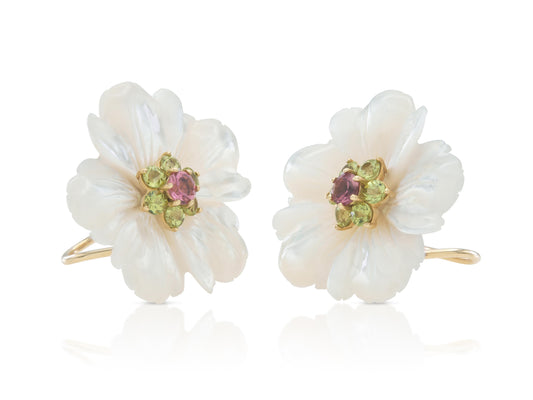 Vintage 1950s Mother of Pearl Flower Earrings with Pink Tourmaline & Peridots