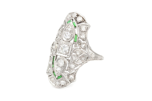 Antique Art Deco 1920s 1.20 Carat Diamond Dinner Ring with Emeralds