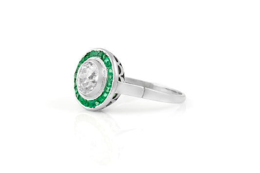 Antique Art Deco 1920s 1.50 Carat Old Mine Cut Diamond Target Ring with Emeralds