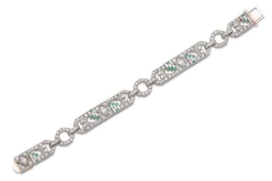 Antique Art Deco 1920s 10.00 Carat Diamond Bracelet with Emeralds