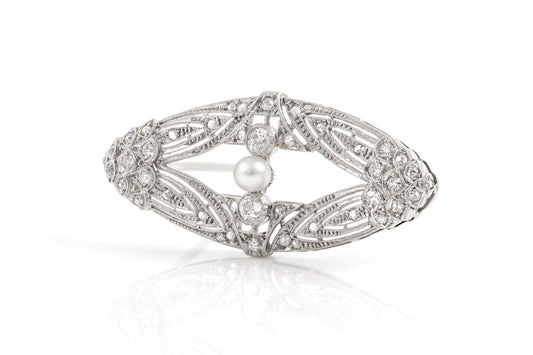 Antique Edwardian 1910s 1.50 Carat Diamond & Pearl Openwork Brooch