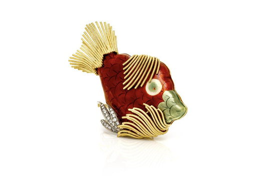 Vintage 1970s Enamel Fish Brooch with Diamonds