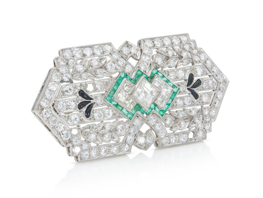 Antique Art Deco 1930s 8.00 Carat Diamond Brooch with Emeralds and Onyx