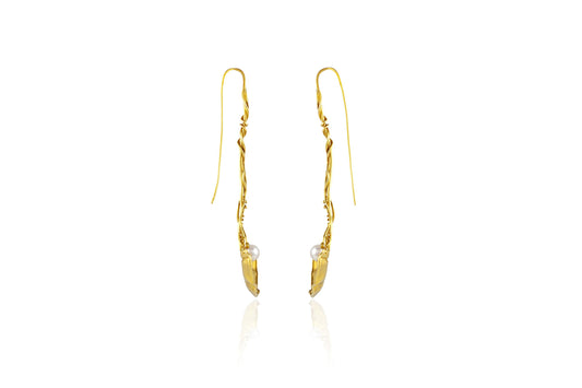 Vintage 1990s Gold Ginkgo Dangle Earrings with Pearls and Diamonds