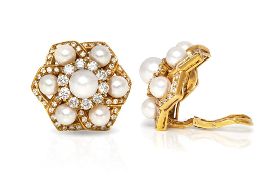 Vintage 1950s Pearl and 13.50 Carat Diamond Flower Earrings