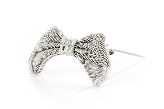 Antique Edwardian 1910s Mesh Platinum Bow Brooch with Diamonds