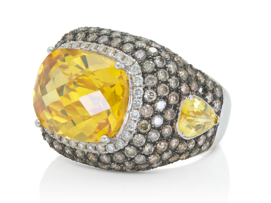 21.84 Carat Yellow Quartz Ring with Brown and White Diamonds