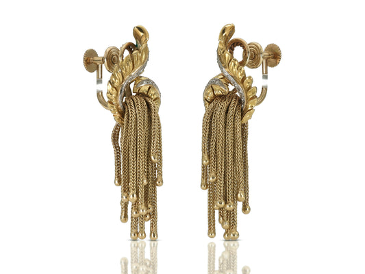 Vintage 1940s Retro Gold Feather Earrings with Tassels and Diamonds