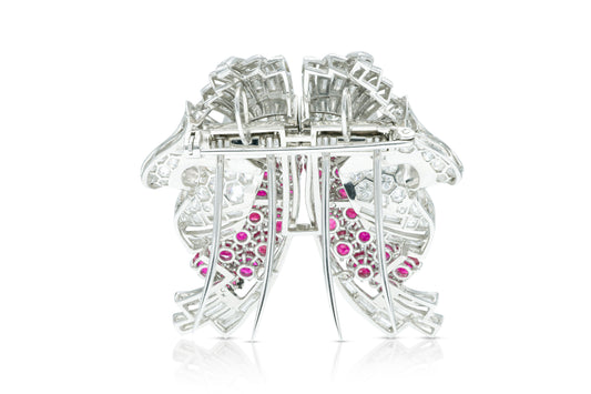 Vintage 1950s 12.00 Carat Diamond & 9.00 Carat Ruby Double Clip Brooch