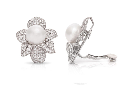Vintage 1950s Pearl and 13.50 Carat Diamond Flower Earrings
