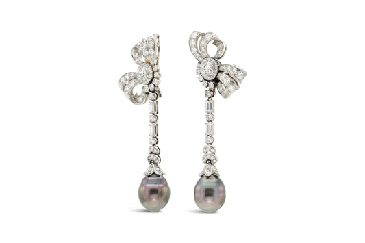 Vintage 1950s Tahitian Pearl and 4.70 Carat Diamond Bow Dangle Earrings