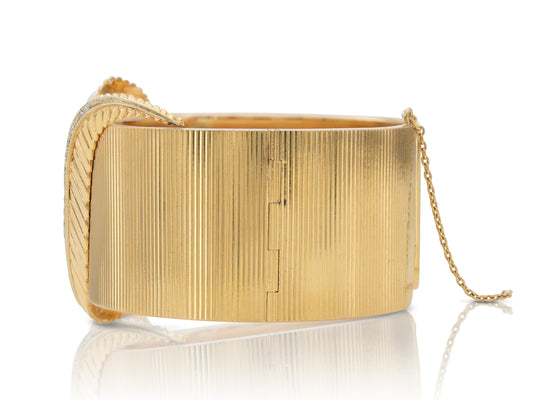 Vintage 1940s Retro Fluted Gold Feather Cuff Bracelet with Diamonds