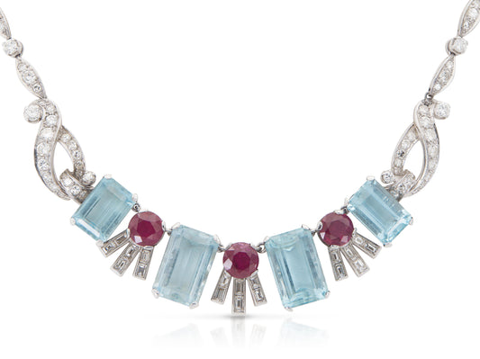 Vintage 1940s Retro Aquamarine, Ruby & Diamond Necklace