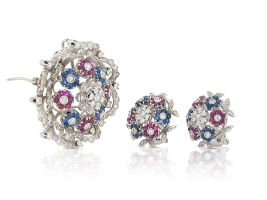 Vintage 1950s Diamond, Sapphire & Ruby Brooch and Earrings Set