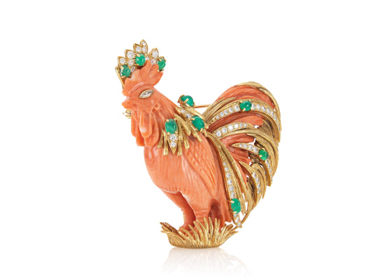 Vintage 1960s David Webb Coral Rooster Brooch with Emeralds and Diamonds
