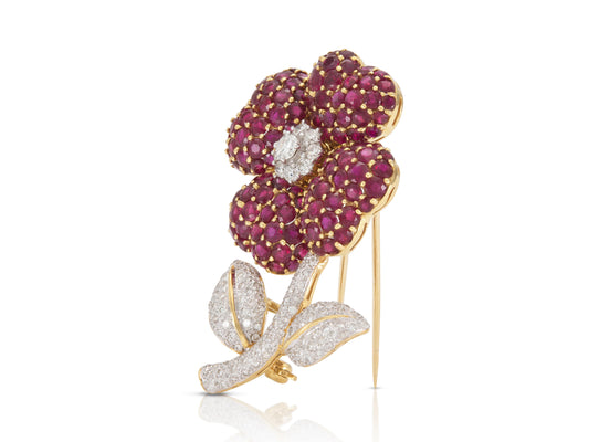 Vintage 1960s 12.80 Carat Ruby Flower Brooch with Diamonds