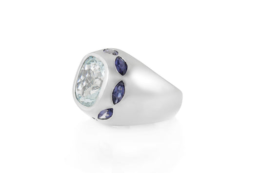 Vintage 1980s 8.00 Carat Cushion Cut Aquamarine Ring with Tanzanites
