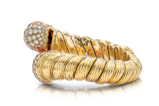 Vintage 1960s David Webb Carved Coral Diamonds and Gold Bypass Cuff Bracelet