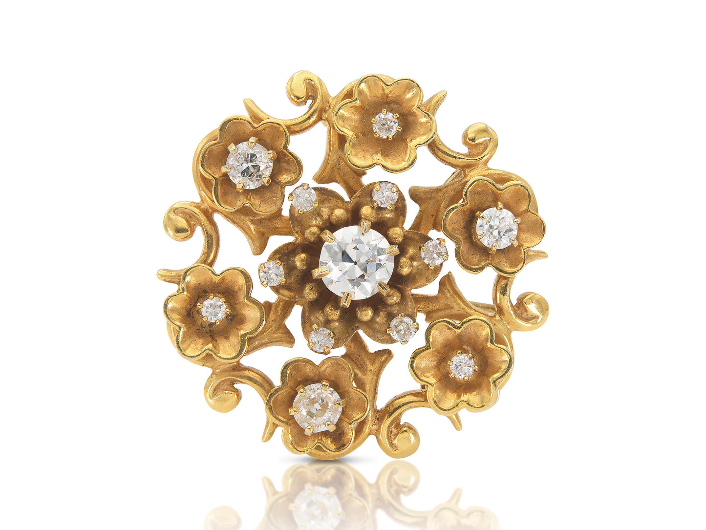 Antique Victorian Gold and 2.00 Carat Diamond Flowers Brooch Pendant
