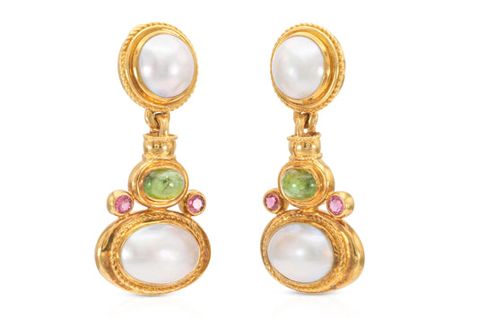 Vintage 1970s Pearl, Peridot, & Tourmaline Dangle Earrings