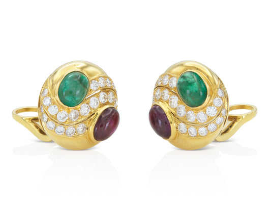 Vintage 1970s Bvlgari Cabochon Emerald and Ruby Earrings with Diamonds